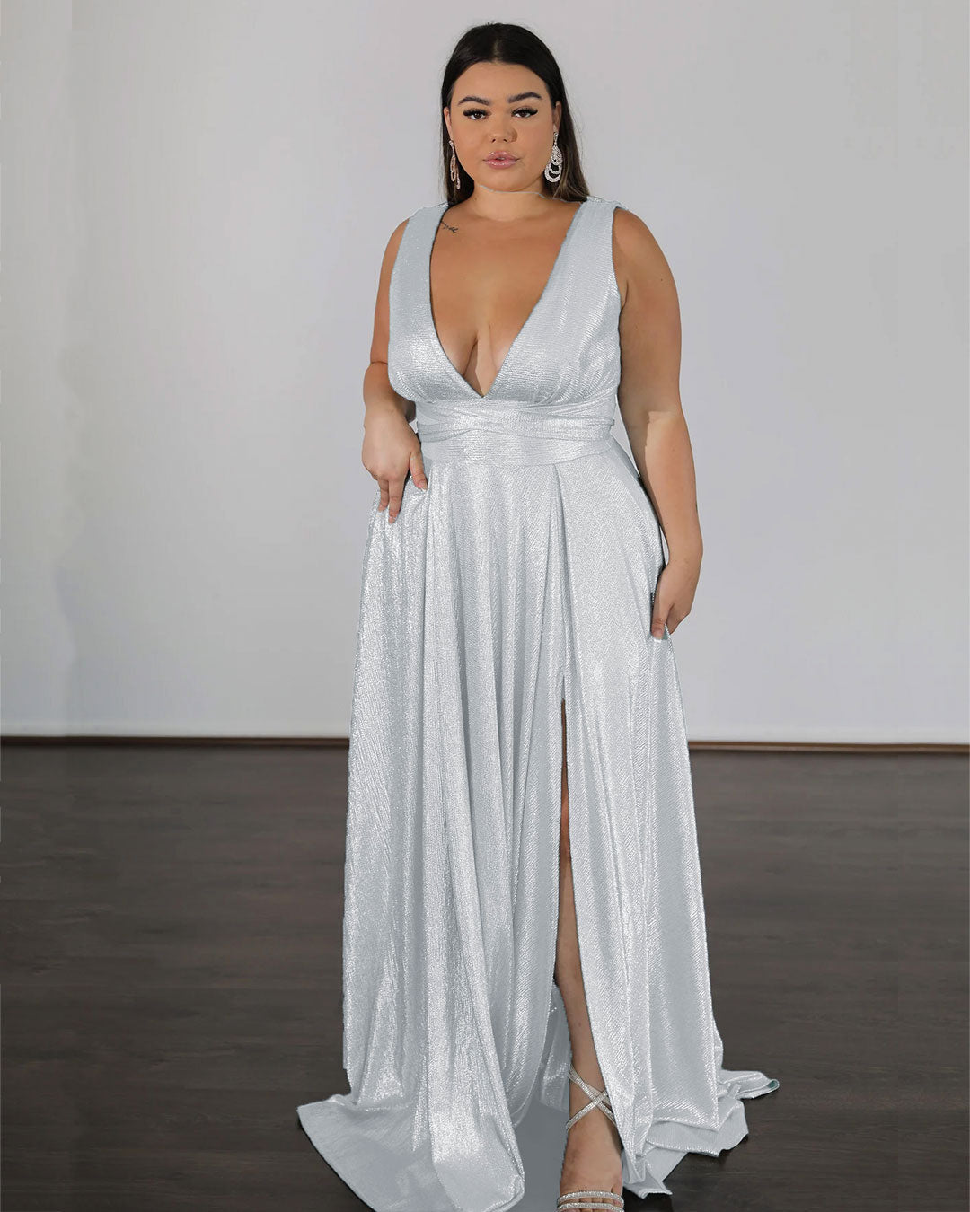 Discover your new dream dress in the 'Lexa' stretch shimmer. The supportive back panels and adjustable waist tie provide the perfect fit while the plunging v-neckline and fully pleated skirt with pockets exude classic elegance. Feel like a star in this show-stopping piece from Once Labeled.