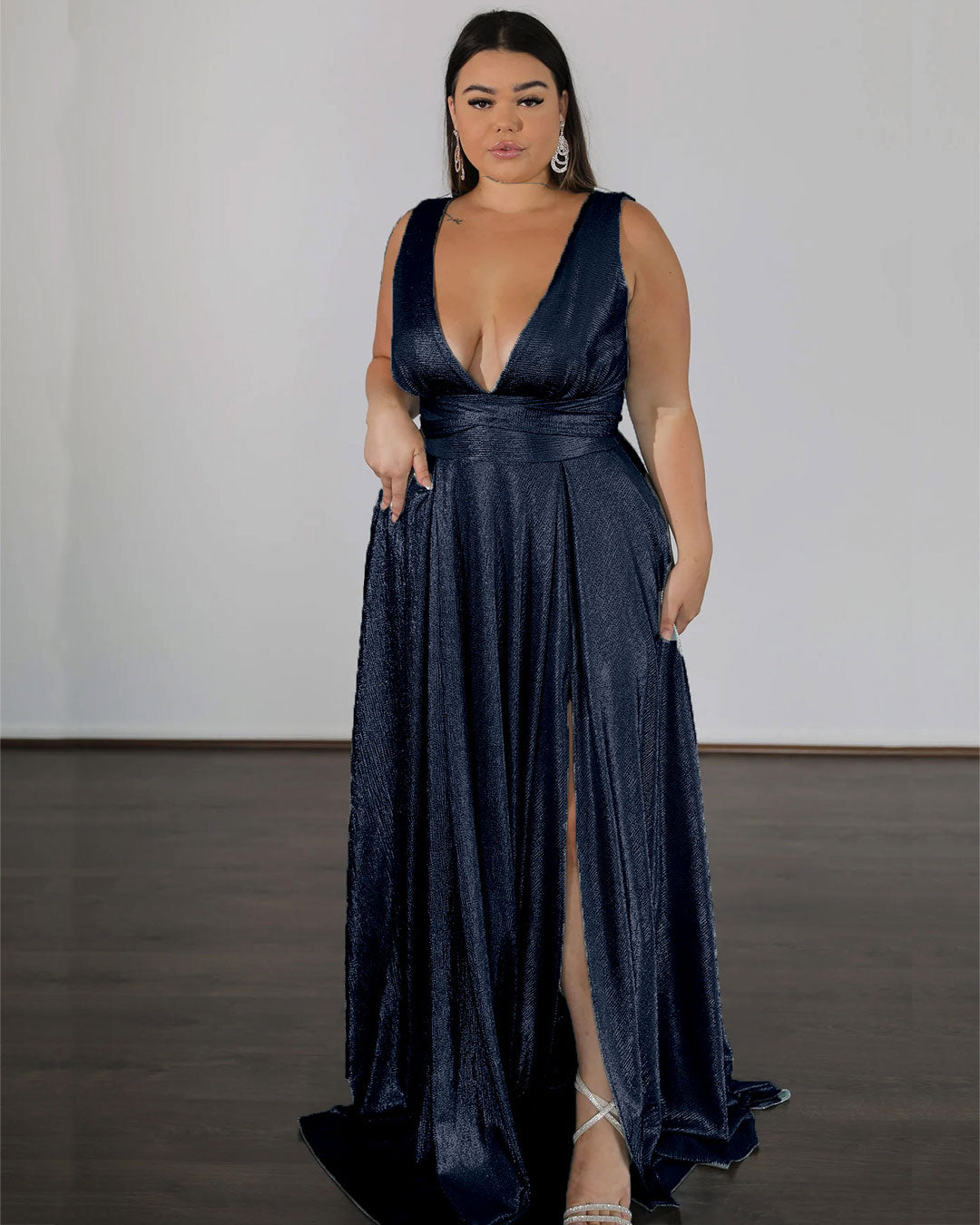 Discover your new dream dress in the 'Lexa' stretch shimmer. The supportive back panels and adjustable waist tie provide the perfect fit while the plunging v-neckline and fully pleated skirt with pockets exude classic elegance. Feel like a star in this show-stopping piece from Once Labeled.