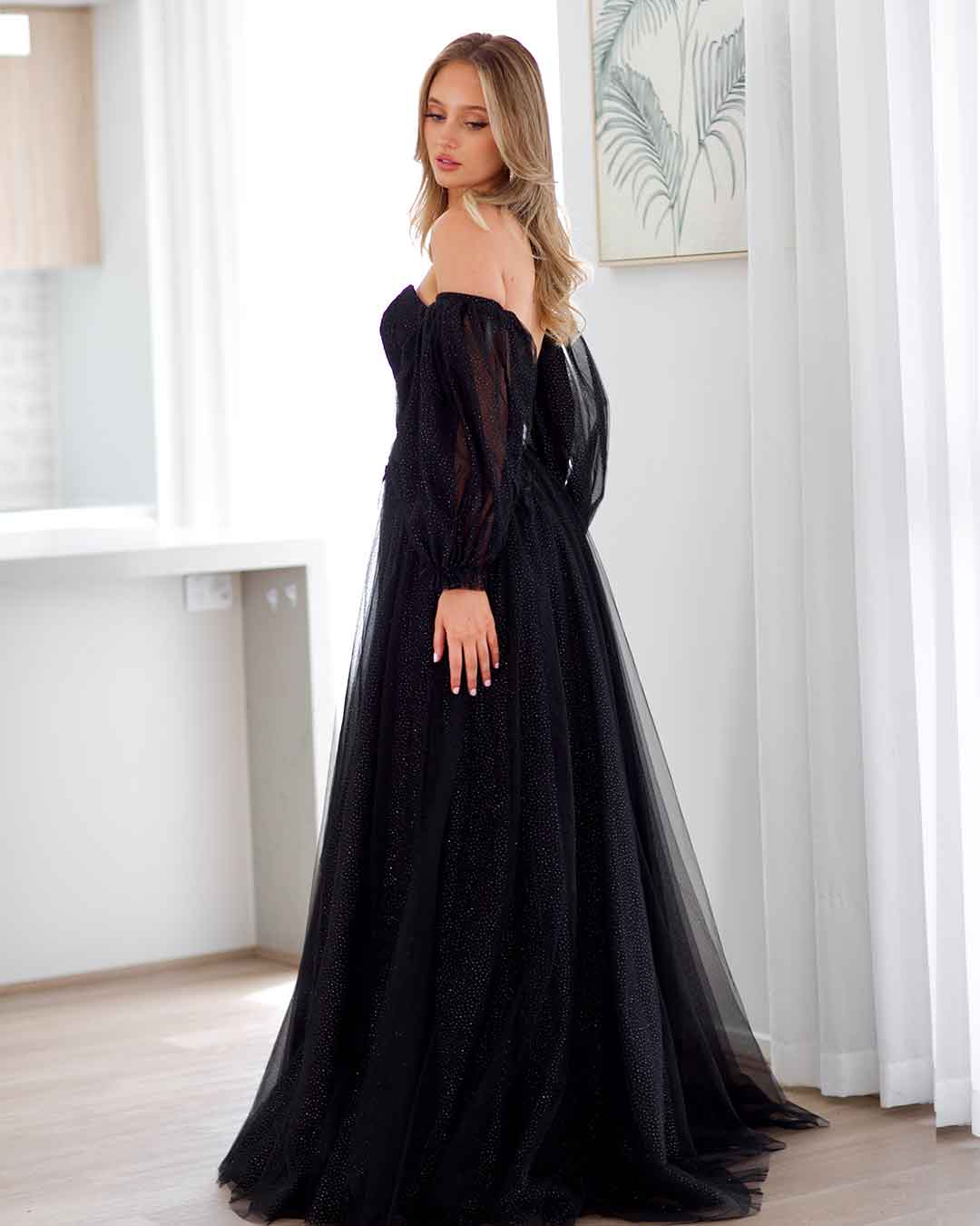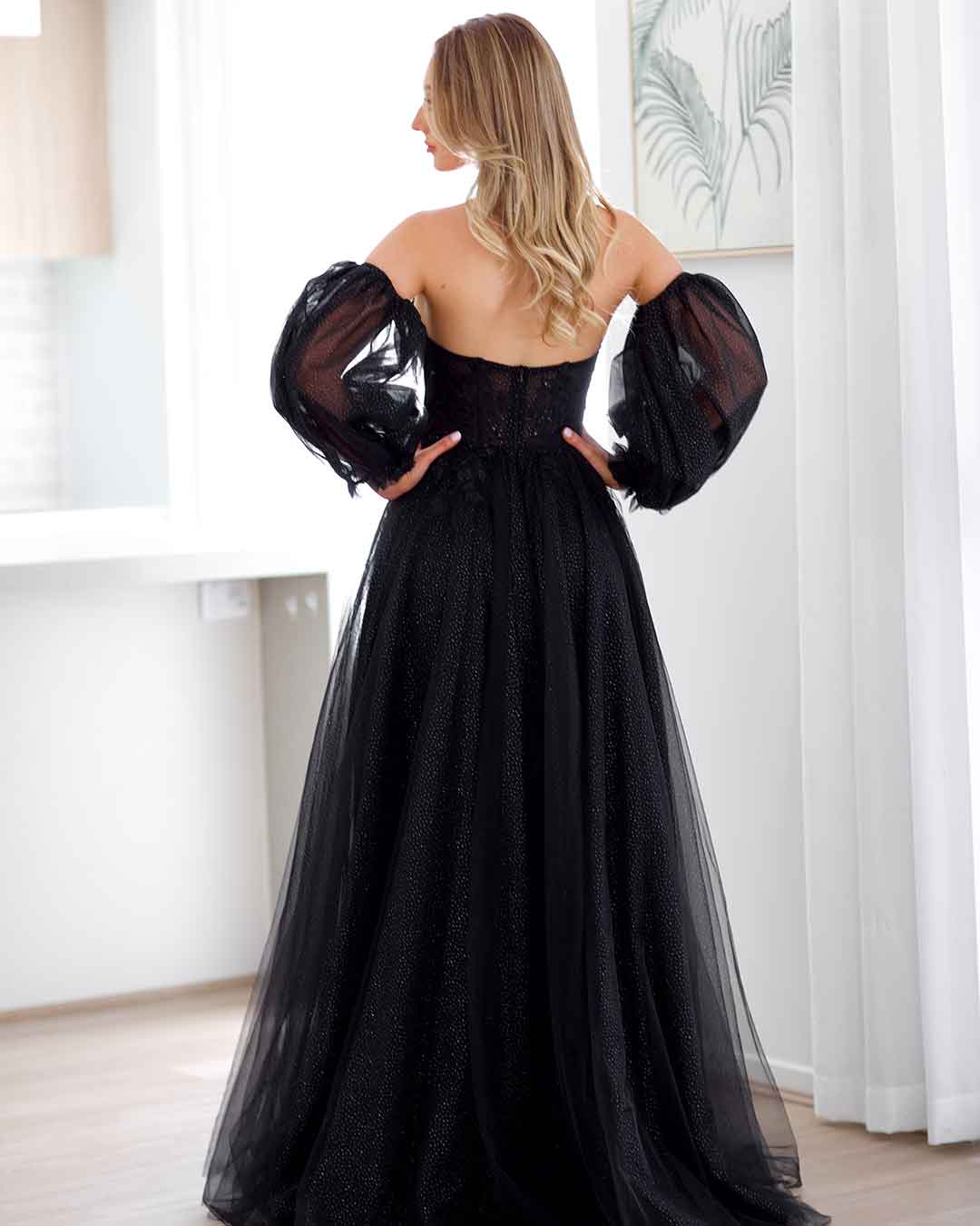 Let’s talk about the stunning Lilia Off Shoulder Tulle Gown! Get ready to turn heads and feel like a total princess at your formal event. First things first, let’s talk about the bodice. It features a modern peaked sweetheart neckline that adds a touch of sophistication and sets you apart from the crowd. And guess what? The bodice is adorned with a sparkling sequin lace applique that will make you shine like a star.