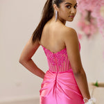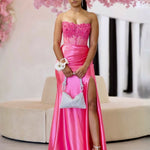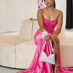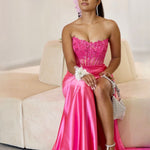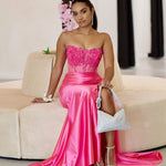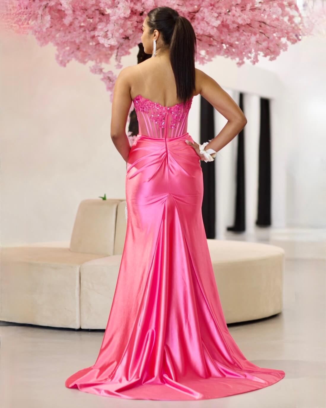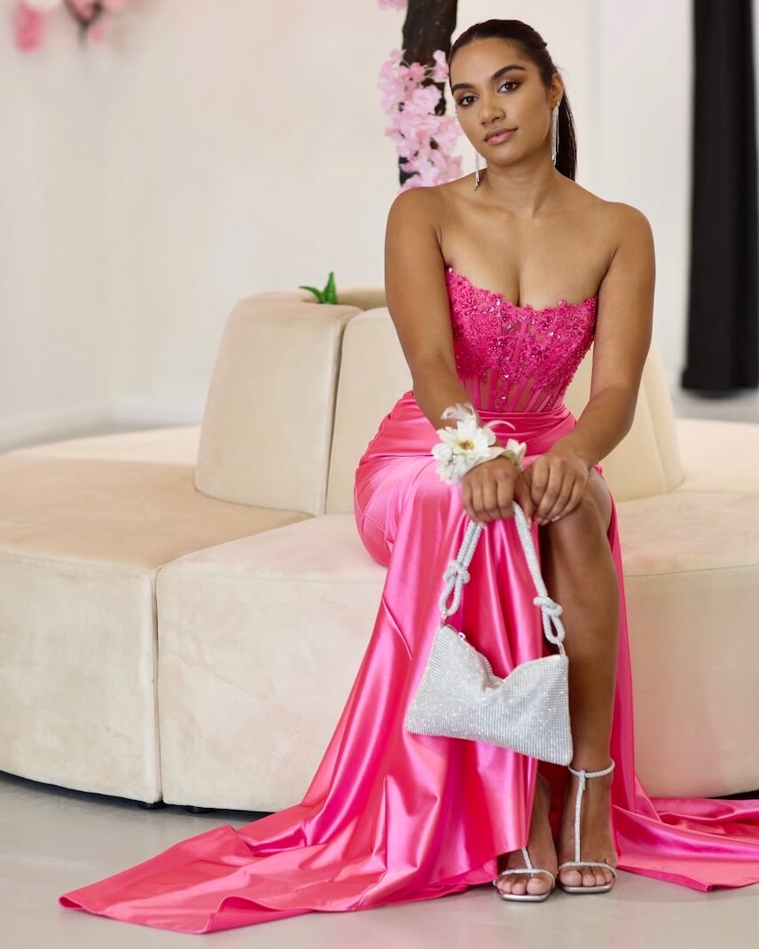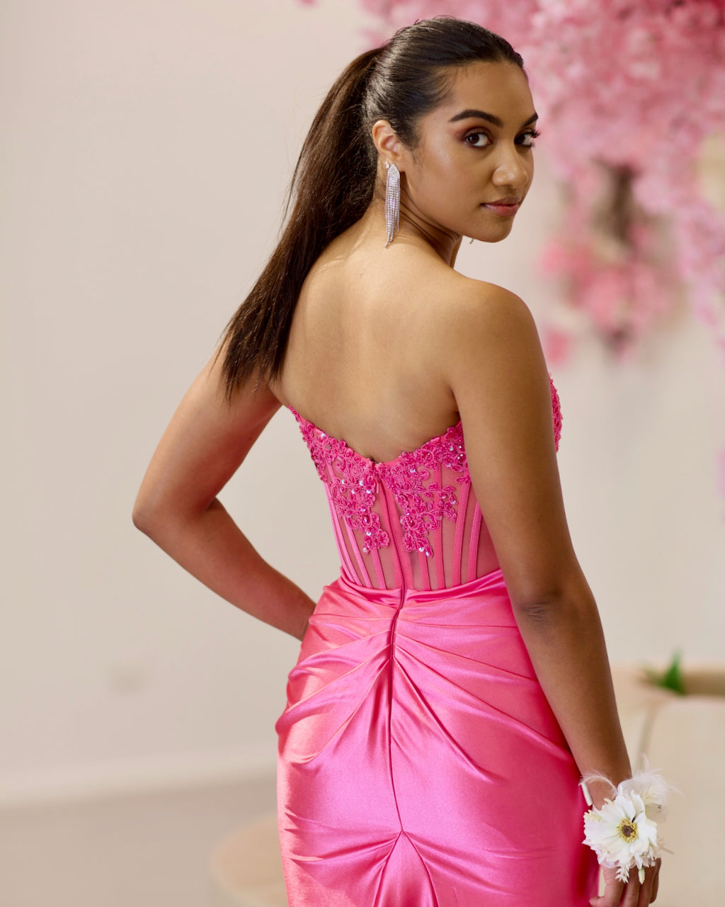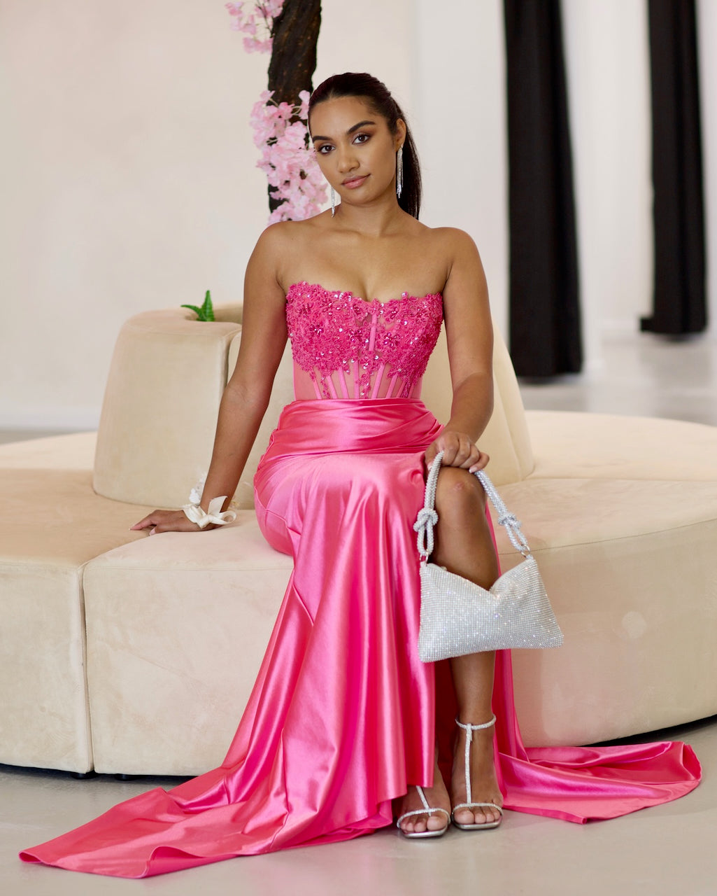 The Madeline Corset Satin Gown – a captivating blend of modern charm and timeless elegance, designed to make you shine at your special event! Crafted from a blend of stretch satin and lace appliqué, this dress is the epitome of sophistication.