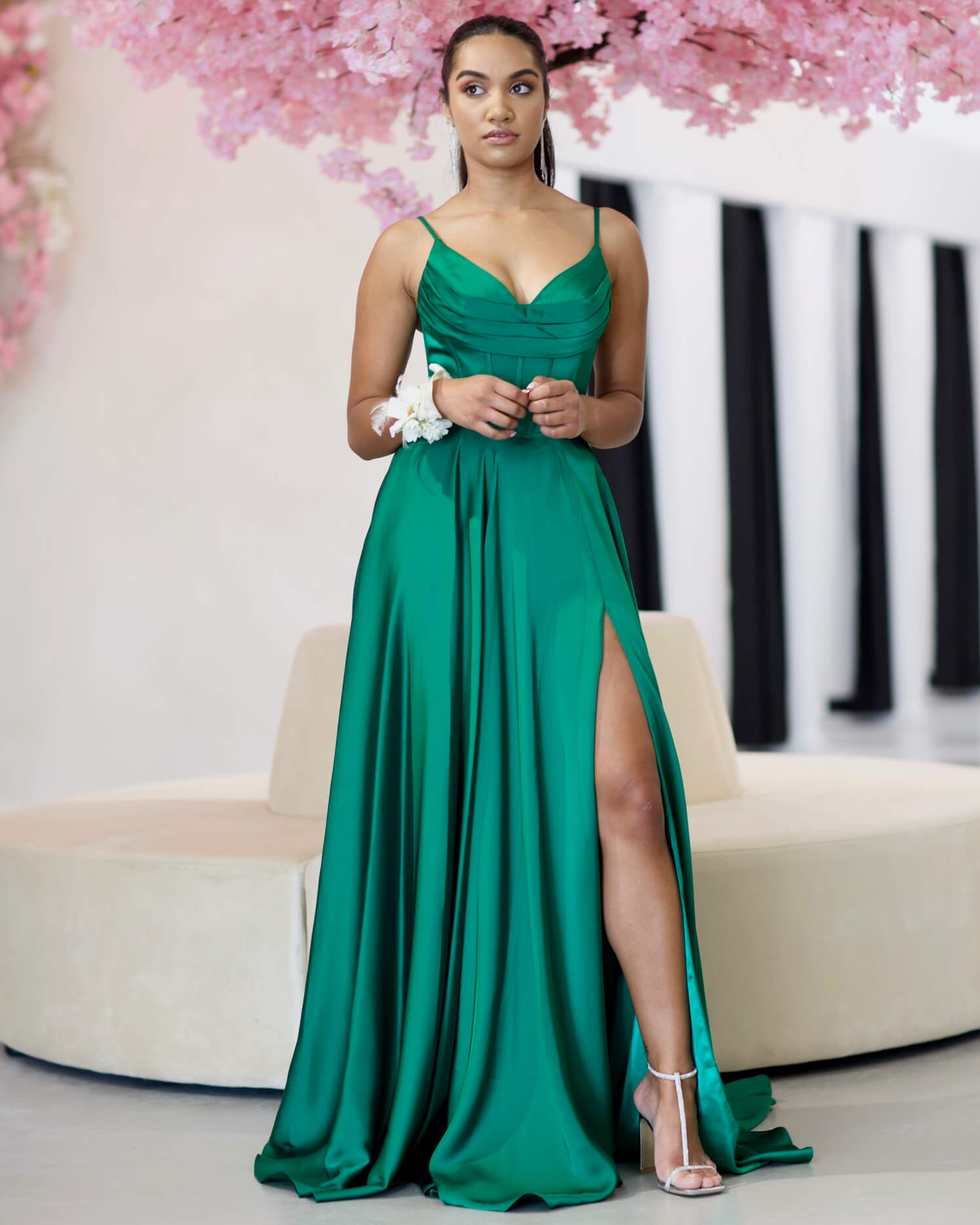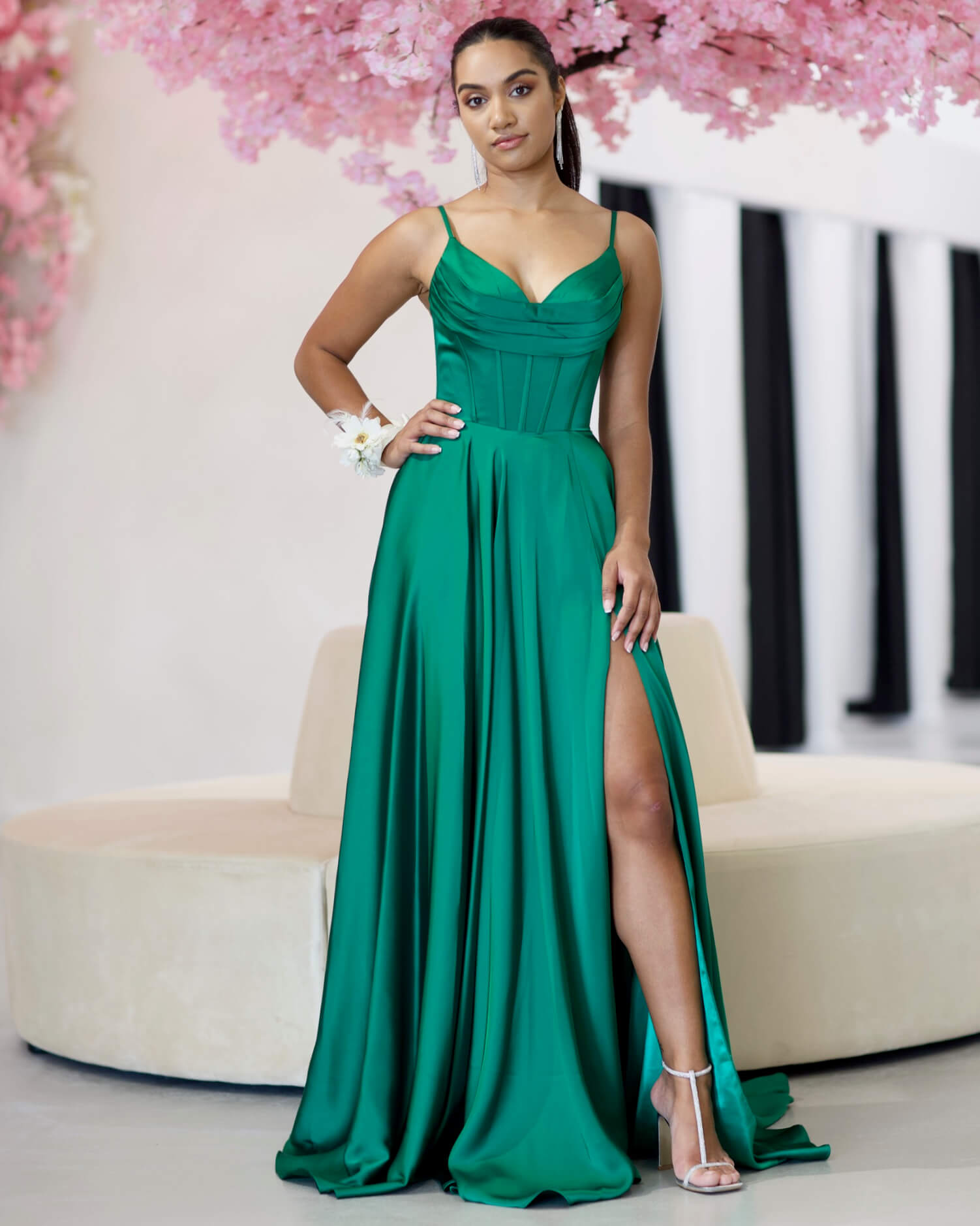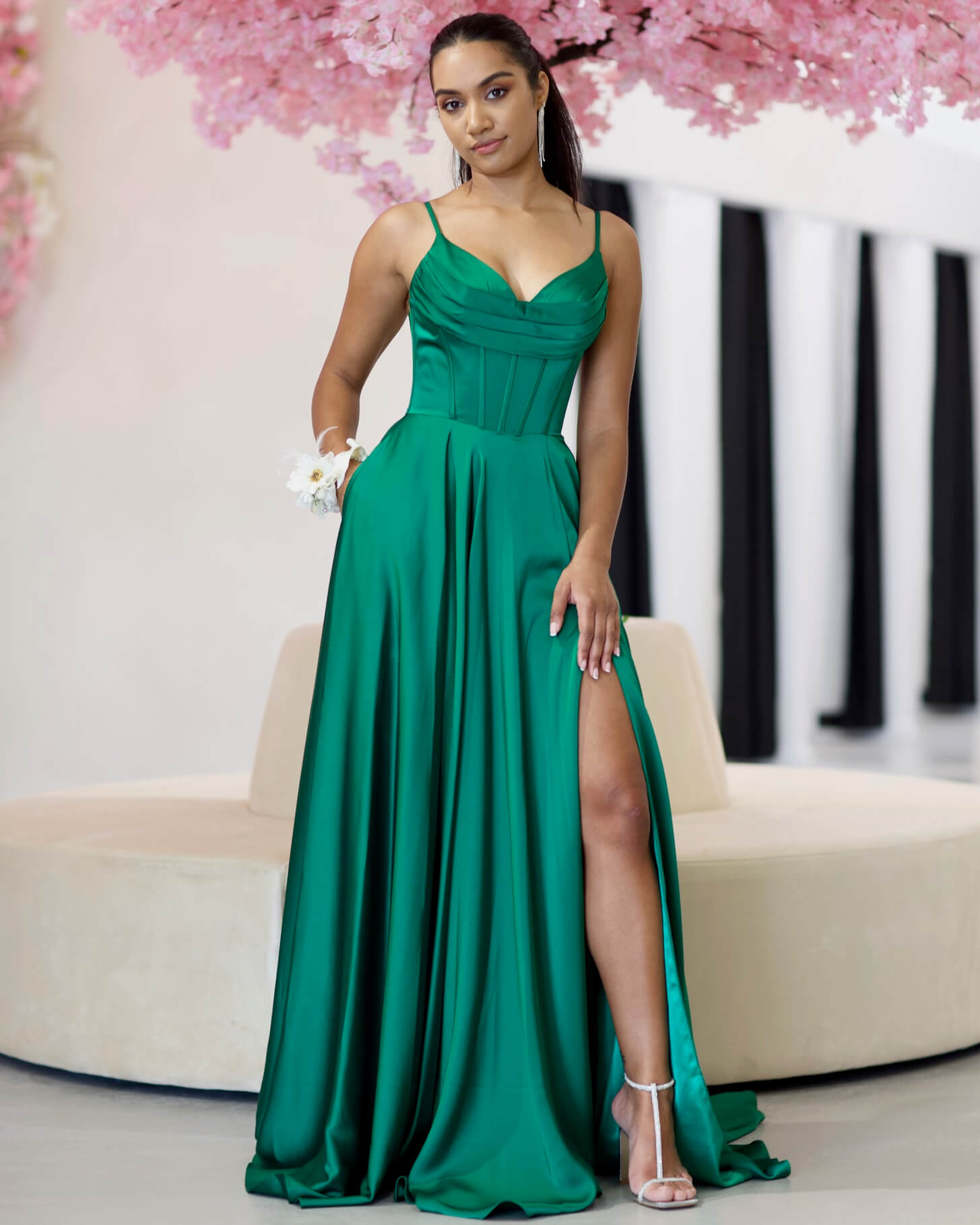 Introducing Marlia Corset Satin Gown. This dress epitomizes sophistication, featuring a sweetheart neckline enhanced by a draped cowl detail. The corset-inspired bodice with exposed boning adds a contemporary edge to its liquid satin fabric. Designed with spaghetti straps and built-in bra cups and boning for support, Mallow ensures both style and comfort. Its A-line silhouette complements diverse body types, while a thigh-high split adds a touch of allure.