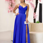 Introducing Marlia Corset Satin Gown. This dress epitomizes sophistication, featuring a sweetheart neckline enhanced by a draped cowl detail. The corset-inspired bodice with exposed boning adds a contemporary edge to its liquid satin fabric. Designed with spaghetti straps and built-in bra cups and boning for support, Mallow ensures both style and comfort. Its A-line silhouette complements diverse body types, while a thigh-high split adds a touch of allure.