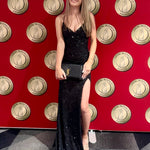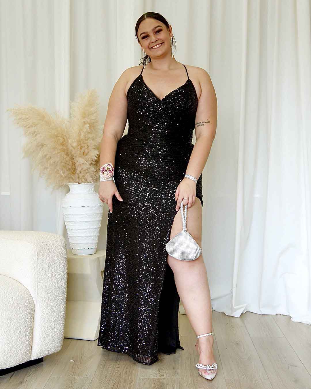 The Neveda Sequin Gown embodies high fashion with its glittering visage of glittering aqua. Perfect for the girl that wants to glow all night.