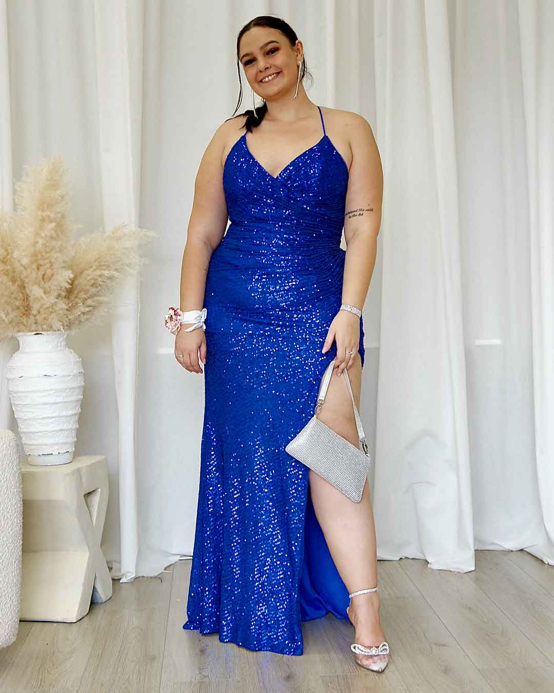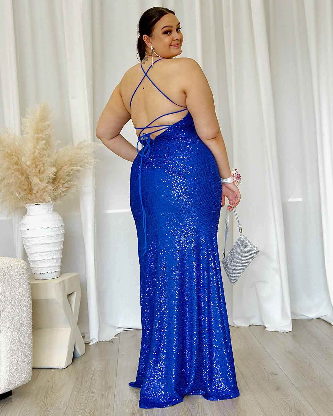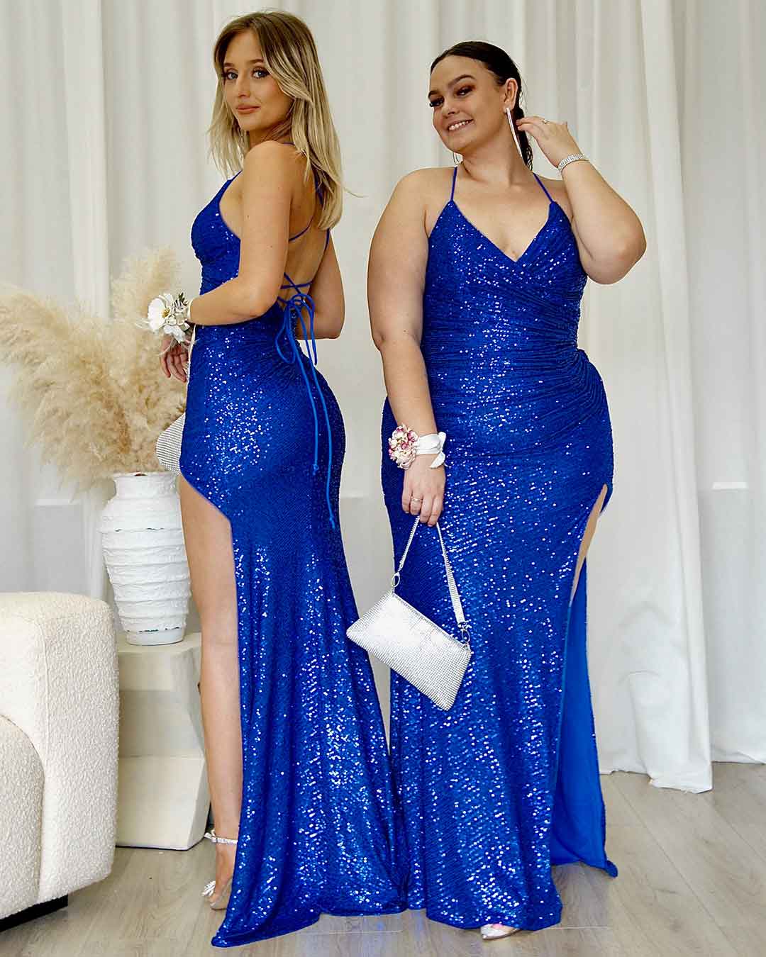 The Neveda Sequin Gown embodies high fashion with its glittering visage of glittering aqua. Perfect for the girl that wants to glow all night.