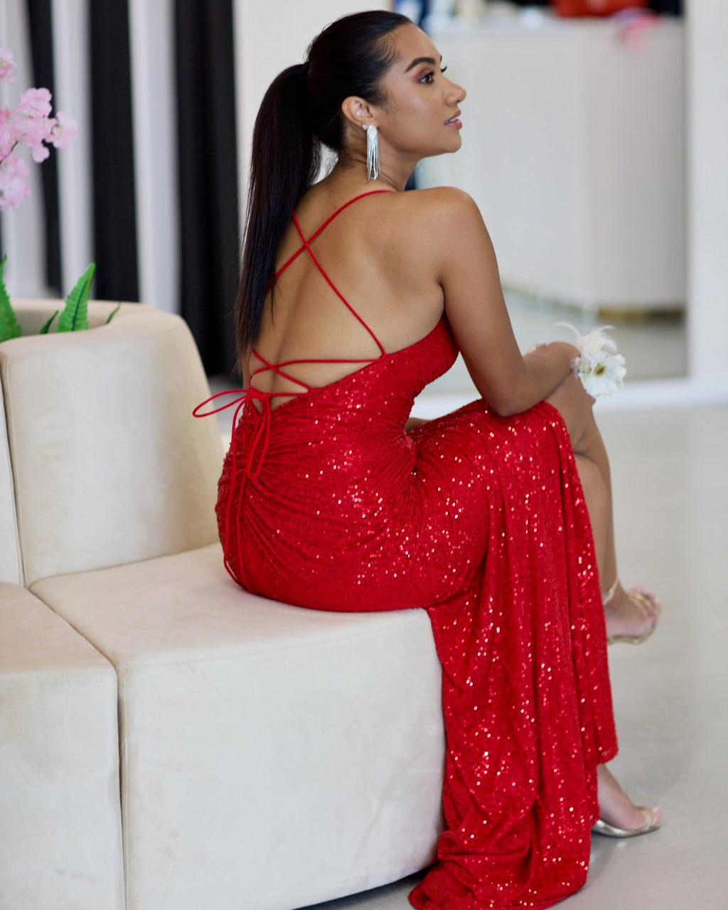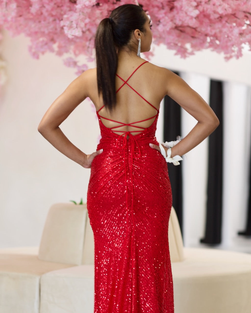 The Neveda Sequin Gown embodies high fashion with its glittering visage of glittering aqua. Perfect for the girl that wants to glow all night.