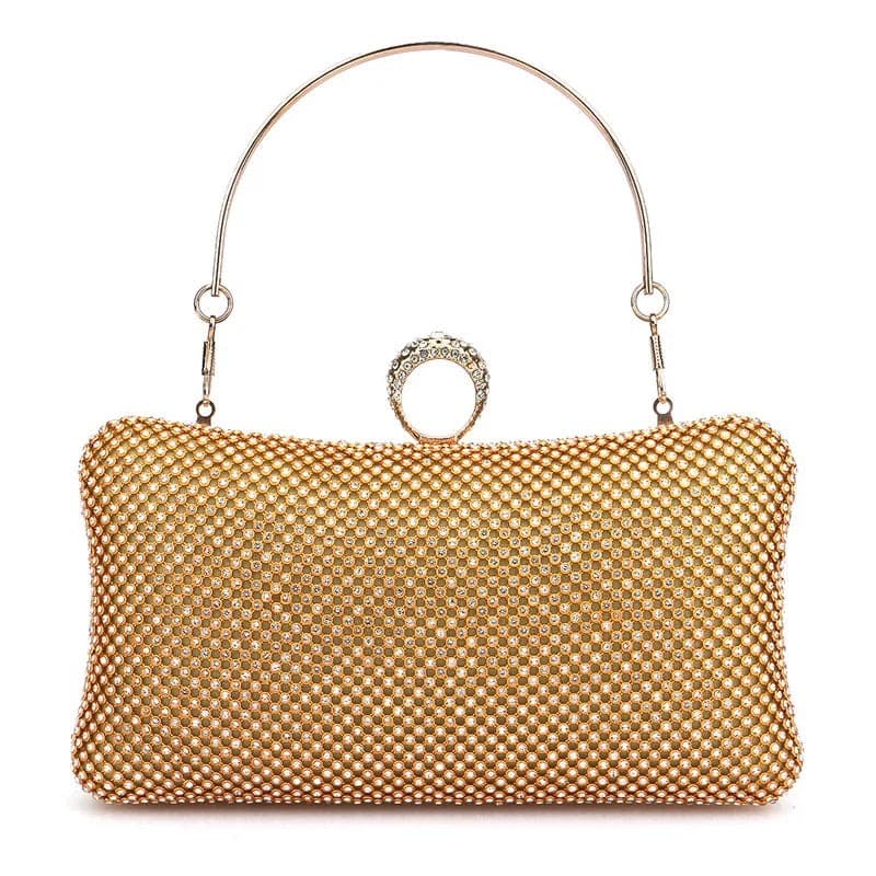 The Night Glam Clutch features a gorgeous ring hold to finish any outfit perfectly. Your choice of metal handle or shoulder strap. Crystals glisten in the night on this cute bag!