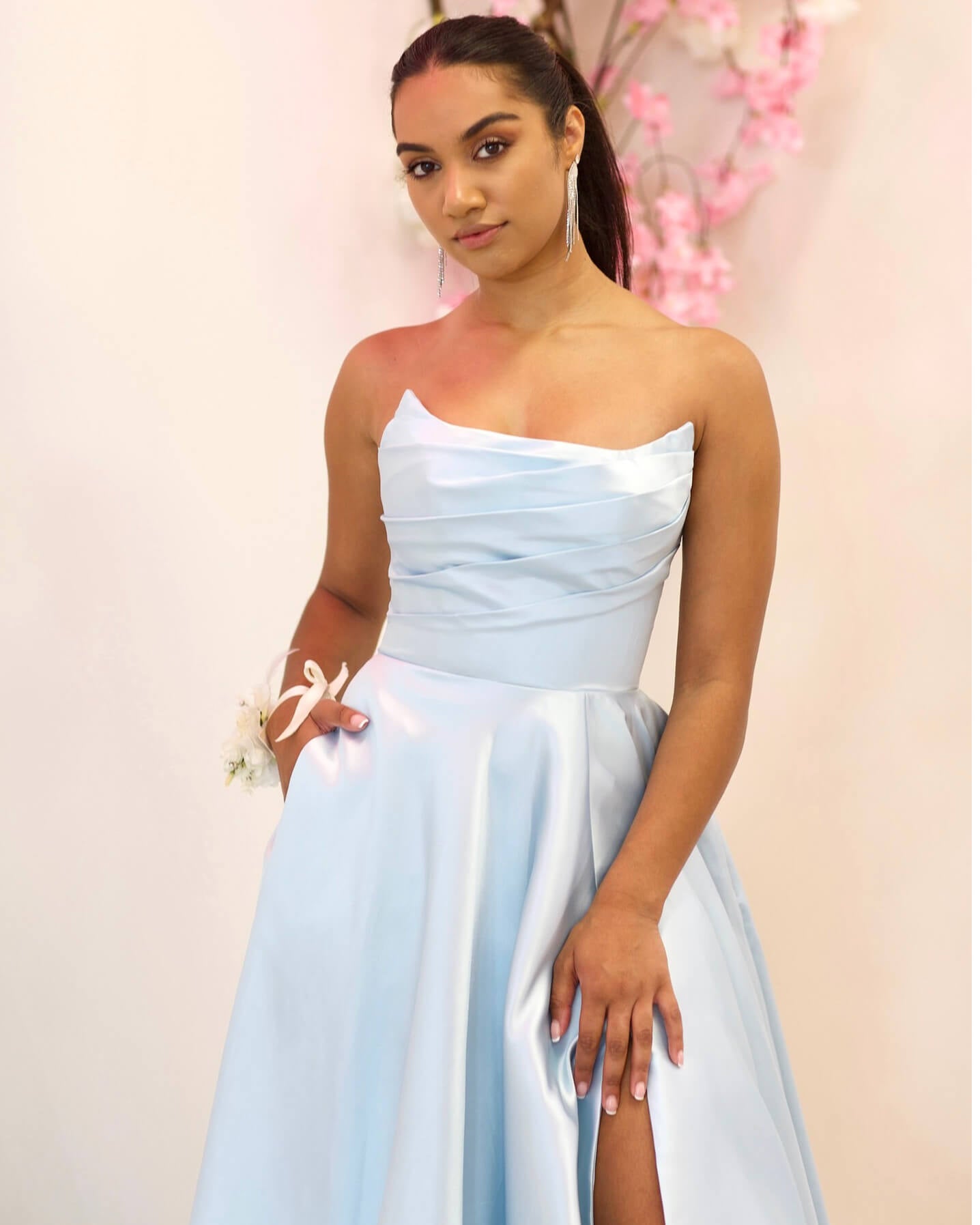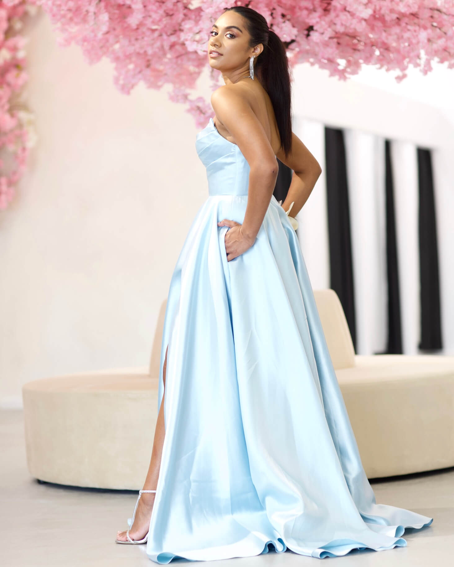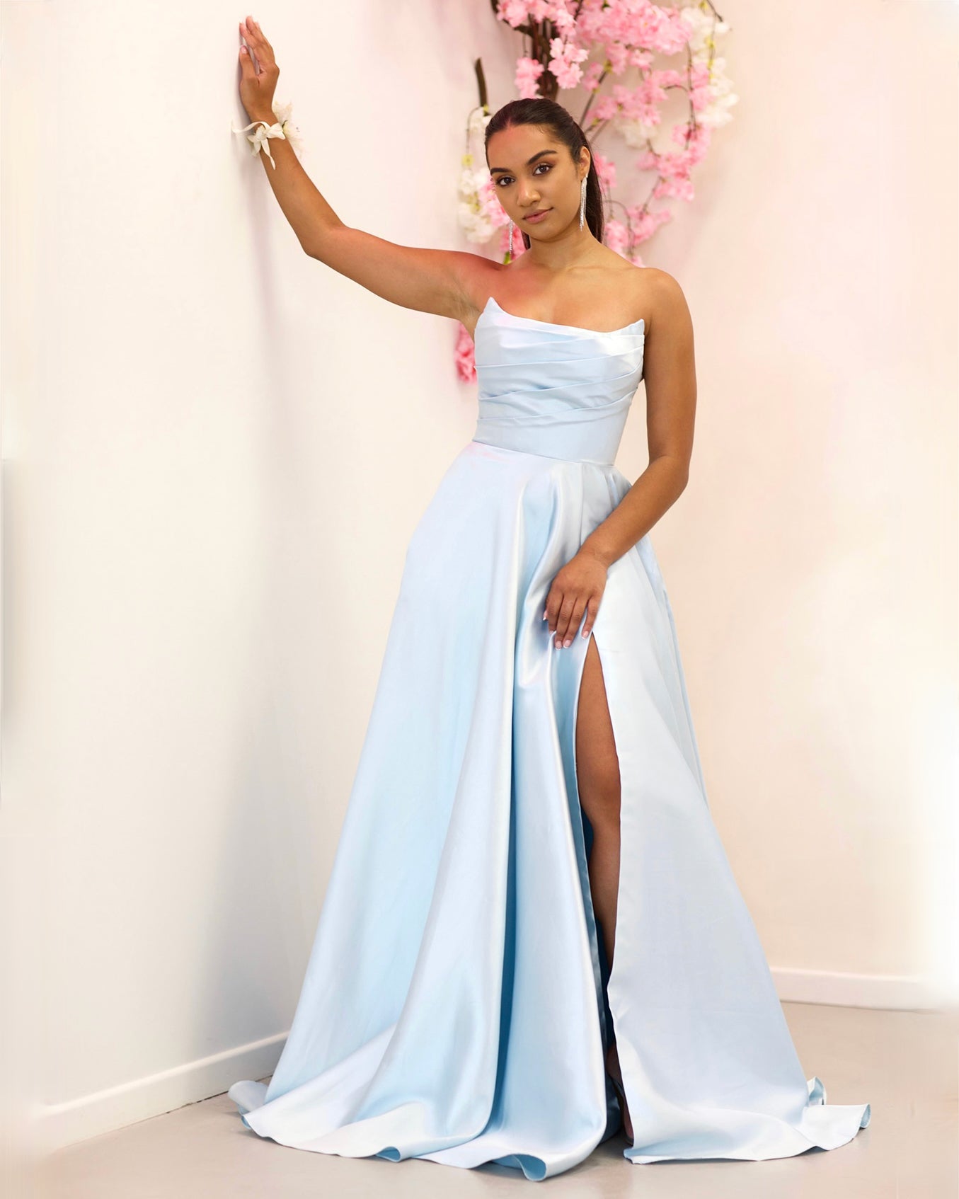 The new beautiful Paola Strapless Gown by Nicoletta features a modern ruching on the strapless bodice, A-line full skirts and a super sexy side split. Made of luxurious Mikado fabric.