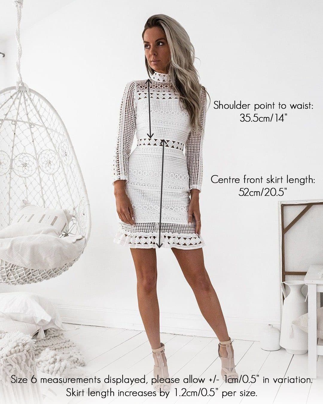 The super sexy yet classy Riverdale Lace Dress is the must have party dress of the season. The dress features a gorgeous high neckline with long sleeves and fitted frill hem skirt. Carefully placed lace pattern for ultimate sexy sheerness on neckline, waist, hem and sleeves.
