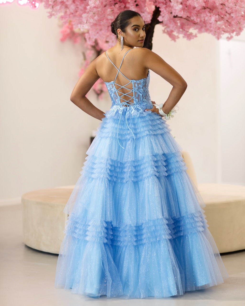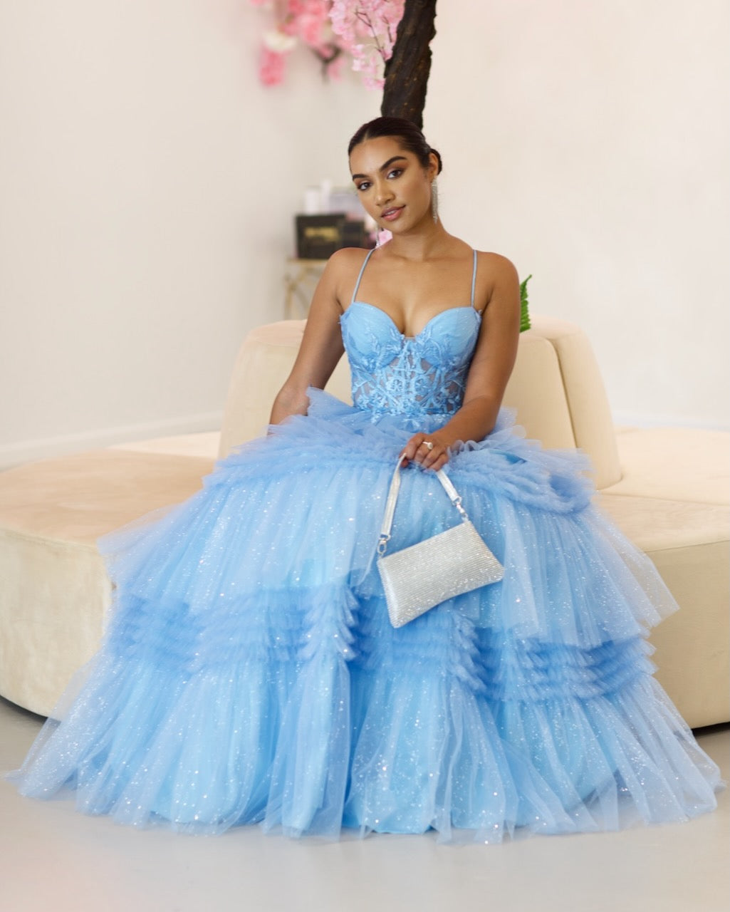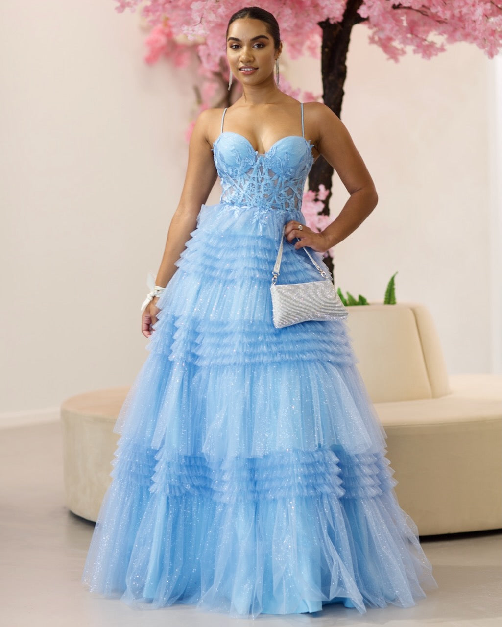Indulge in the ethereal beauty of our Rosamund Layered Tulle Gown. Adorned with a boned corset bodice and delicate lace applique, this gown exudes sophistication. The layered tulle skirt and lace-up back add a touch of romance.