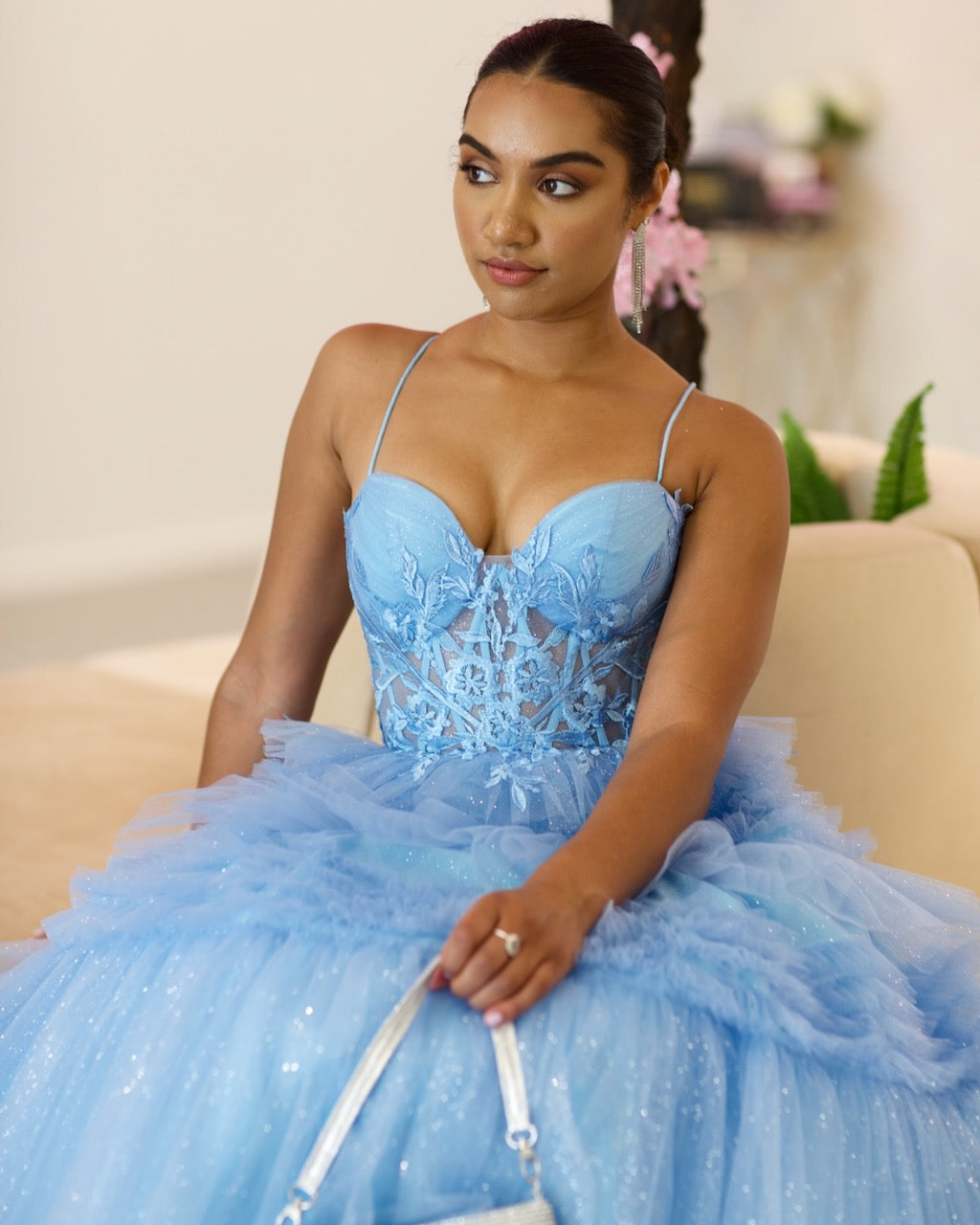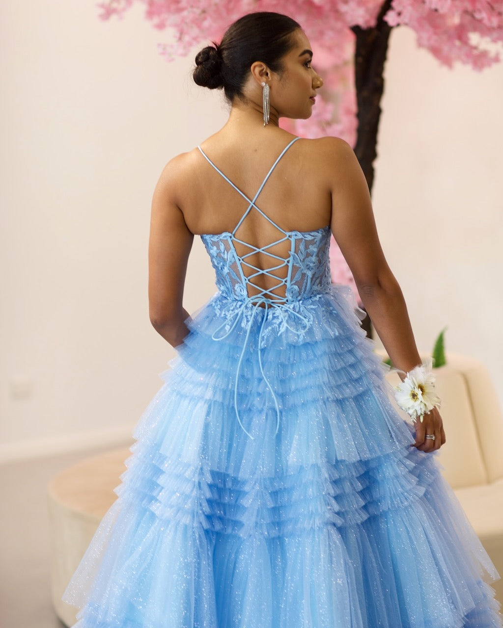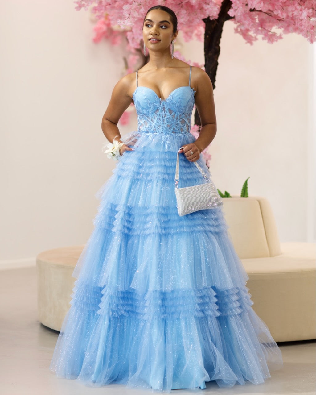 Indulge in the ethereal beauty of our Rosamund Layered Tulle Gown. Adorned with a boned corset bodice and delicate lace applique, this gown exudes sophistication. The layered tulle skirt and lace-up back add a touch of romance.