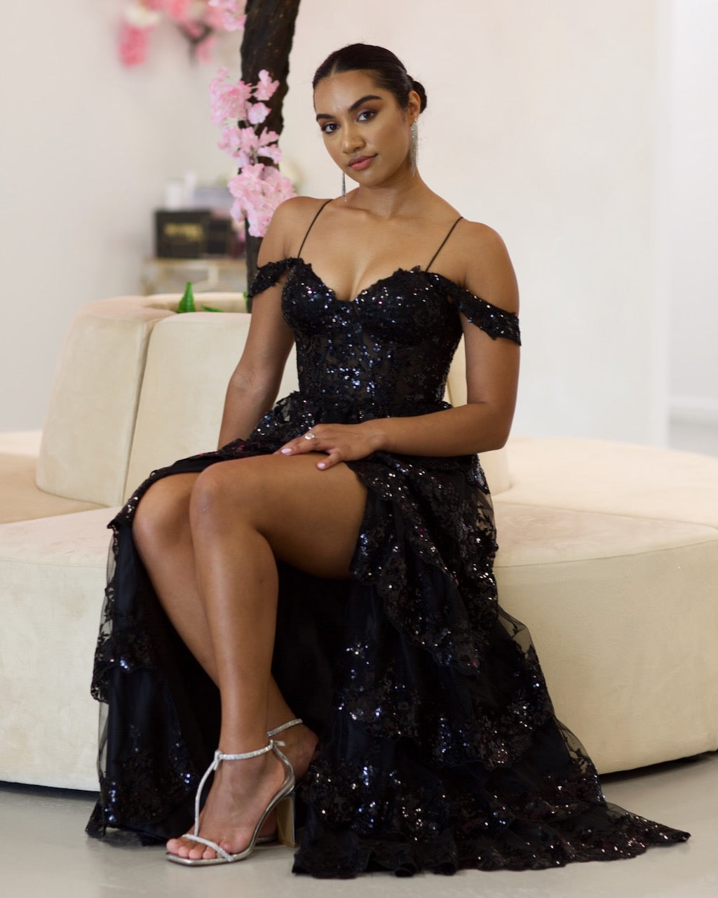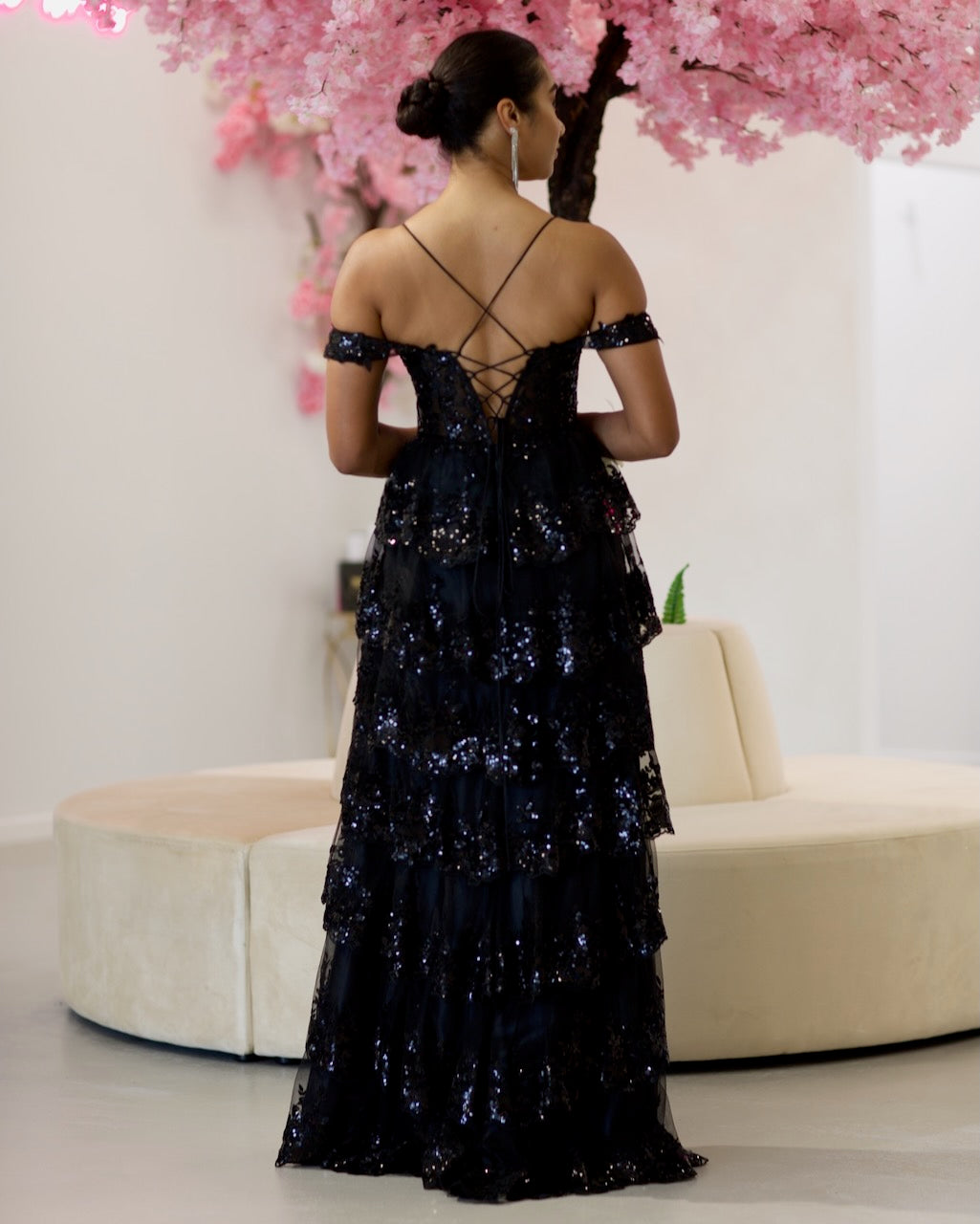 Unleash your bold and daring side with the Suki Corset Layered Gown. Made with stunning sequin fabric, this off-the-shoulder gown features a corset top and layered full skirt that will make you stand out in any crowd. The lace-up back adds a touch of appeal, while the leg slit adds a hint of adventure.