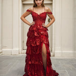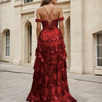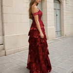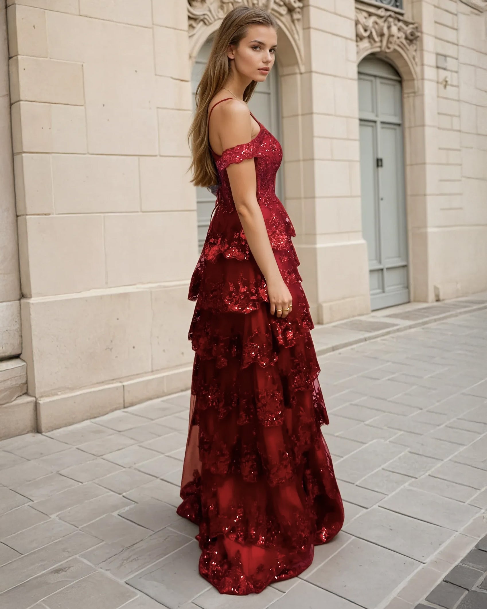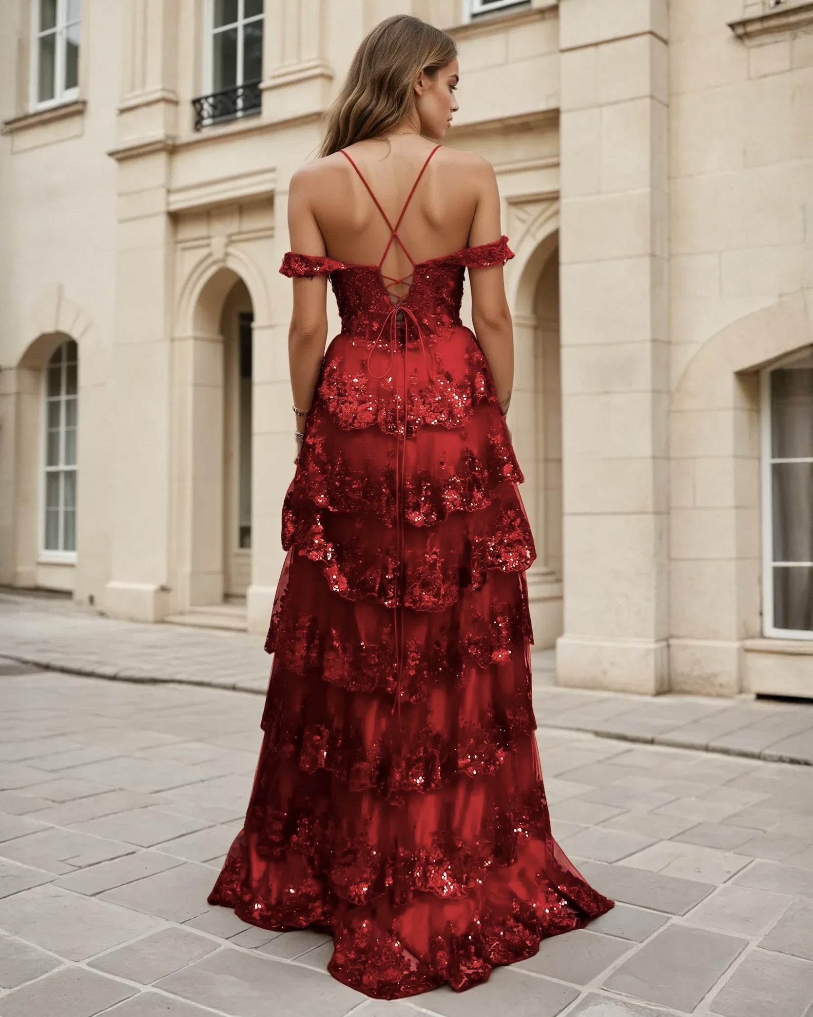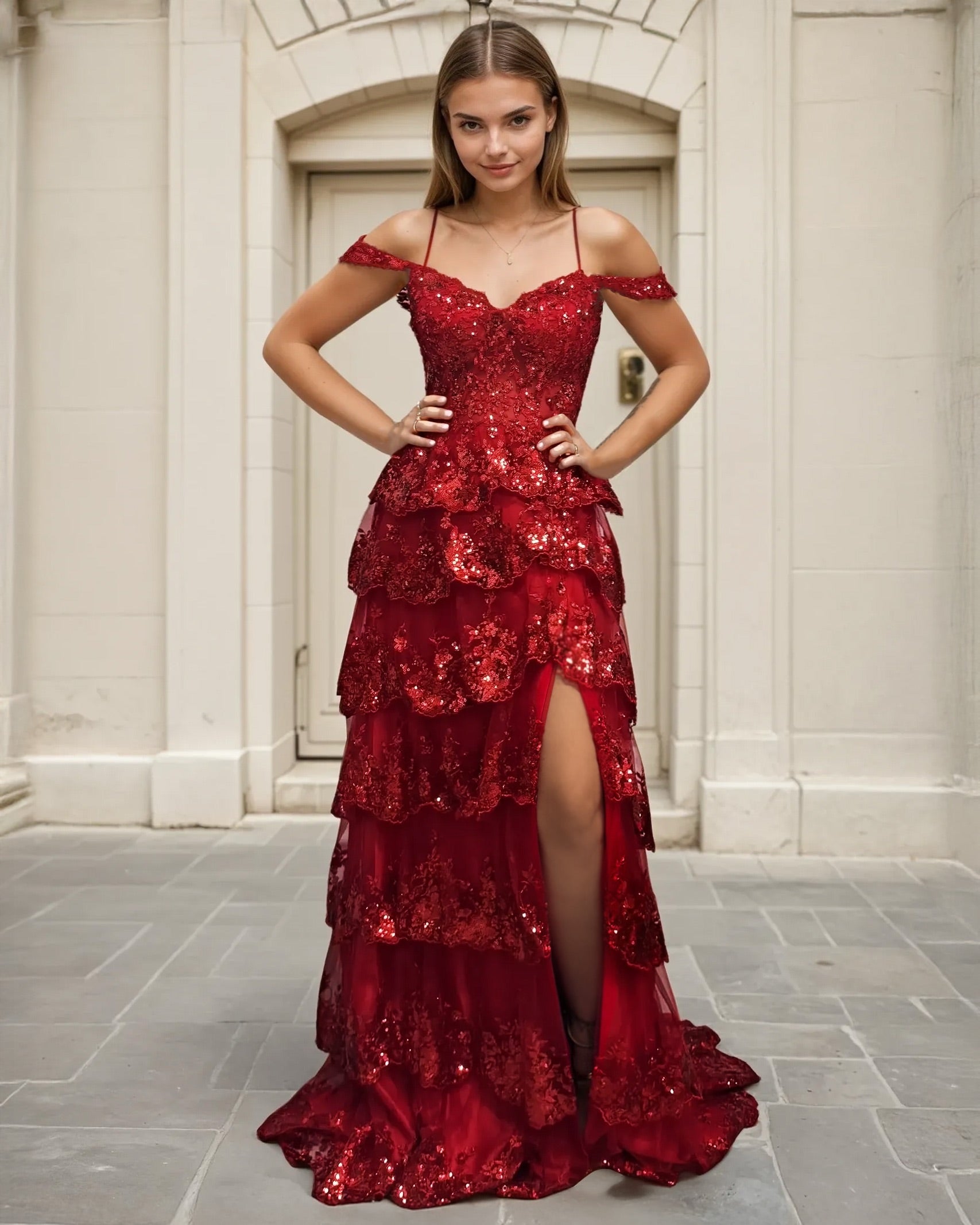 Unleash your bold and daring side with the Suki Corset Layered Gown. Made with stunning sequin fabric, this off-the-shoulder gown features a corset top and layered full skirt that will make you stand out in any crowd. The lace-up back adds a touch of appeal, while the leg slit adds a hint of adventure.