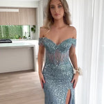 Look like a total knockout in the show-stopping Tatiana Corset Sequin Gown! This glamorous gown will have you walking into your special night feeling like a queen. You’ll be sure to turn heads in this sexy number with its off-the-shoulder straps and sheer boned bodice that gives it classic glamour, while the sweetheart neckline provides an attractive look that is both modern and chic. The leg slit adds a dose of sass and class, so you can be confident yet still make a statement when you walk in. Whether it's prom night, a wedding, or any other special event, be sure to shine in this remarkable dress!