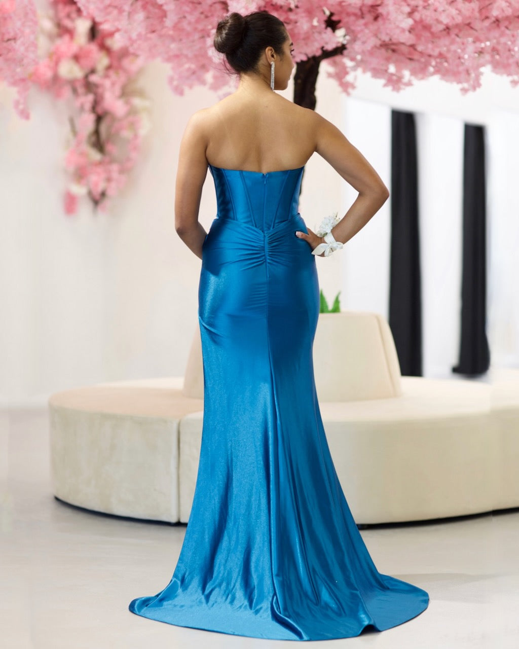 Step into glamour with the Tess Strapless Corset Gown. Designed with a boned corset bodice to accentuate your waist and curves, this gown exudes elegance and sophistication. The gathered hip and side leg slit create a sultry, flattering silhouette, while the beaded bust adds a touch of refined glam. Perfect for any special occasion, this figure-hugging gown ensures you'll turn heads and feel confident all night long.
